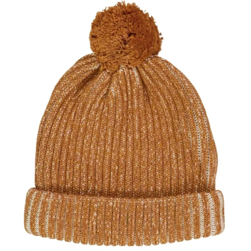 Hue i kraftig ribstrik med kvast på toppen til dit barn. Huen er i økologisk bomuld med en bred ribkant, der kan foldes op efter behov og styling. Huens strik er tofarvet, og bliver først synlig, når huen kommer på hovedet/man strækker i materialet.Sammensætning: