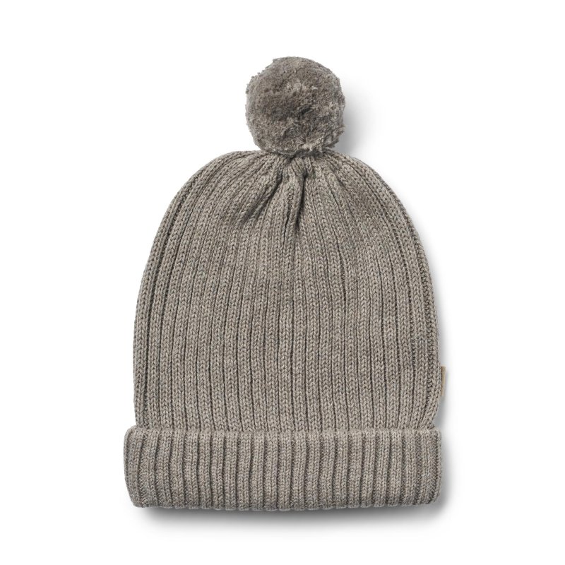 Wheat's hue er både komfortabel og praktisk til den kolde efterårs- og vintersæson. Den strikkede hue har en kvast på toppen. Den kan foldes ned til den længde, der passer bedst til dit barns hoved.