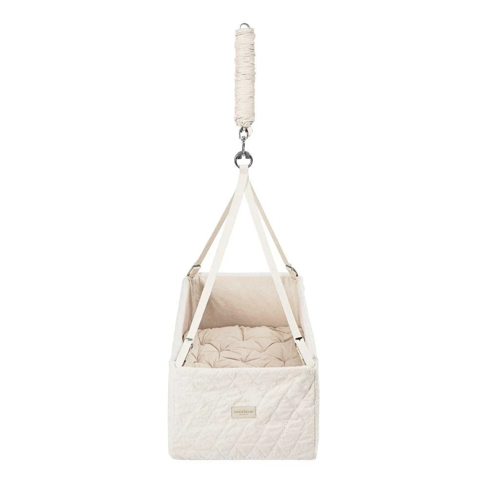 1 sæt justerbare vuggestropper i økologisk kanvas. Med ankerspænder i rustfrit stål til højdejustering samt en rustfri stålring til ophæng.