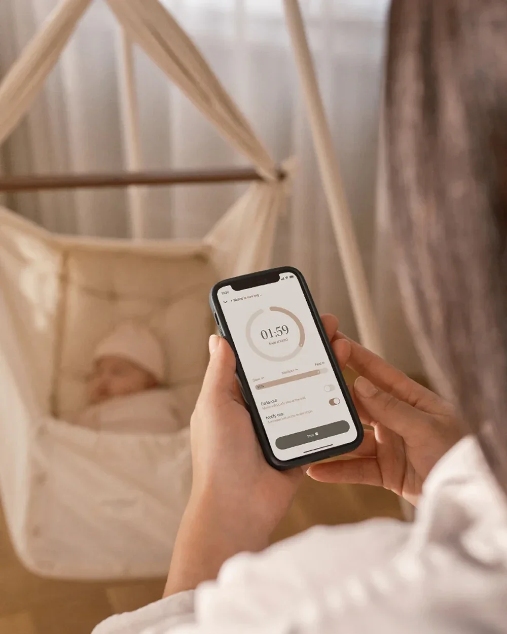 Med muligheden for at tænde og styre motoren via Moonboons app kan du selv indstille både vuggehastighed og vuggetid. Du kan også bruge et af deres søvnprogrammer, som er designet af søvneksperter med henblik på at skabe de bedste rammer for kvalitetssøvn for din baby.