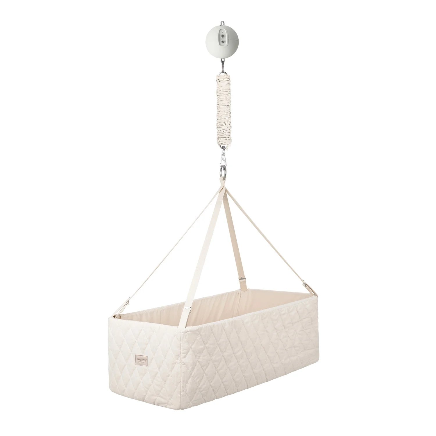 1 sæt justerbare vuggestropper i økologisk kanvas. Med ankerspænder i rustfrit stål til højdejustering samt en rustfri stålring til ophæng.Vuggemotor1 stk. vuggemotor