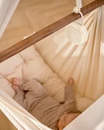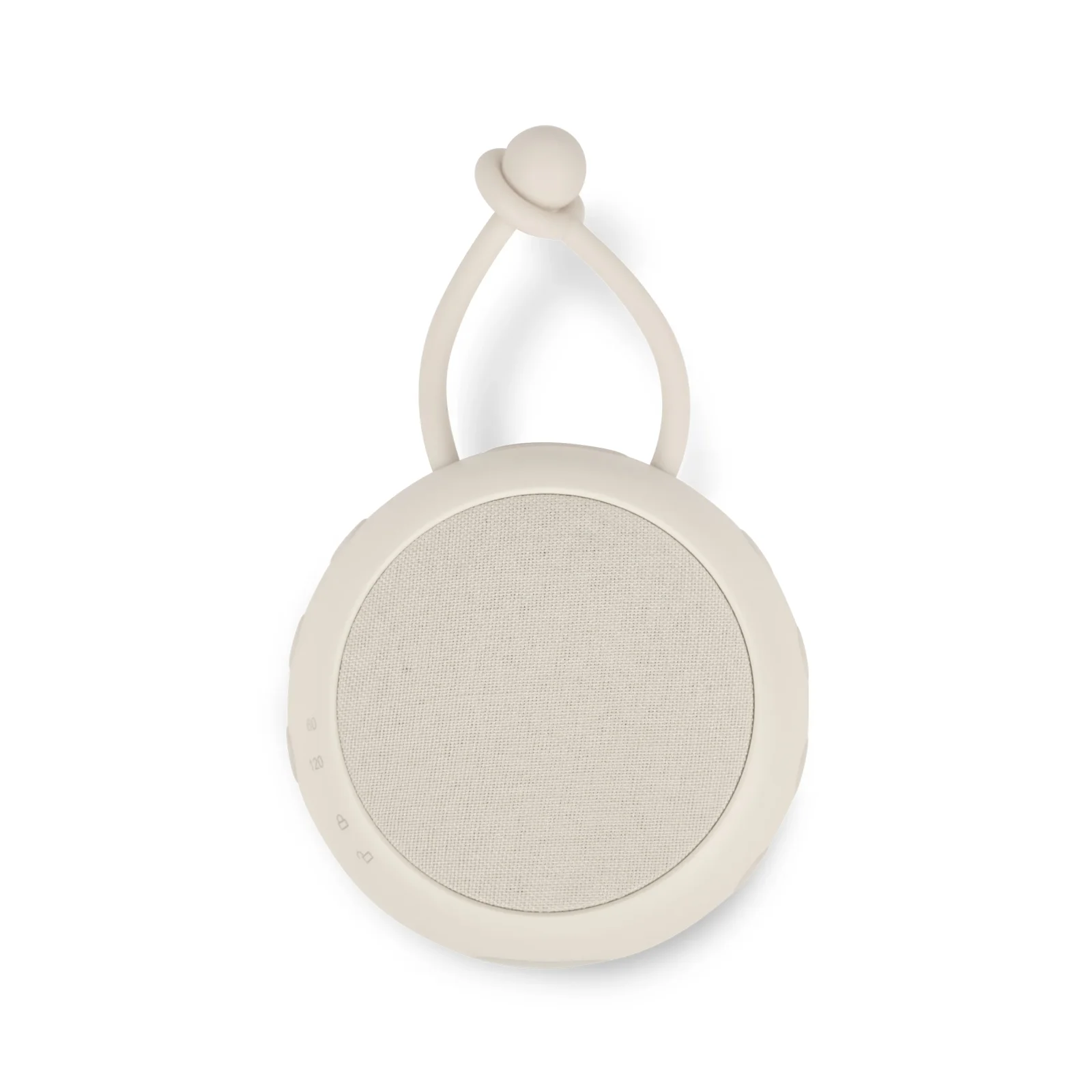 Højttaleren har en indbygget silikonestrop, så den nemt kan hænges op, f.eks. i tværpinden på slyngevuggen.