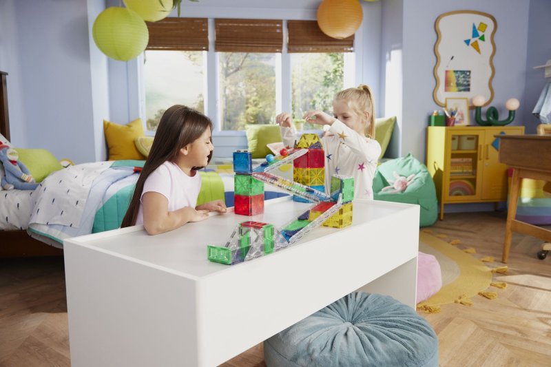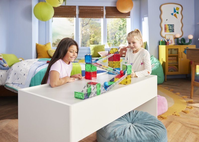 Byg fantasifulde Deluxe kuglebaner med MAGNA-TILES store magnetiske bygge- og legesæt. Inkl. 2 kugler, baneskinner og microMAGS. 90 dele.