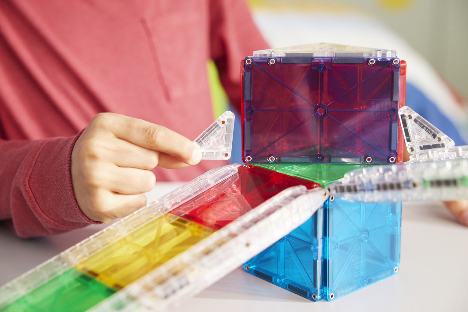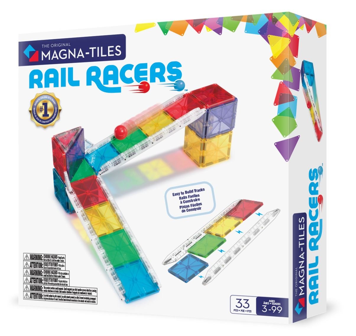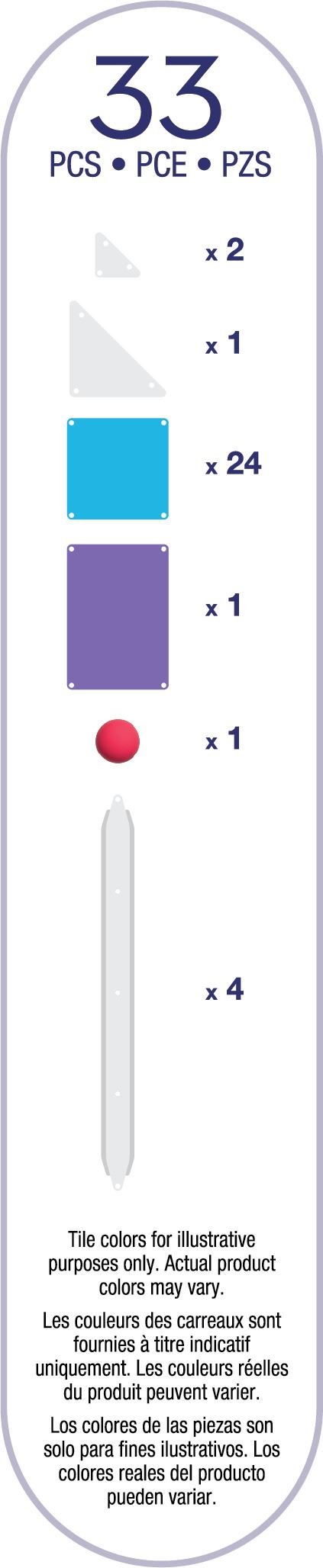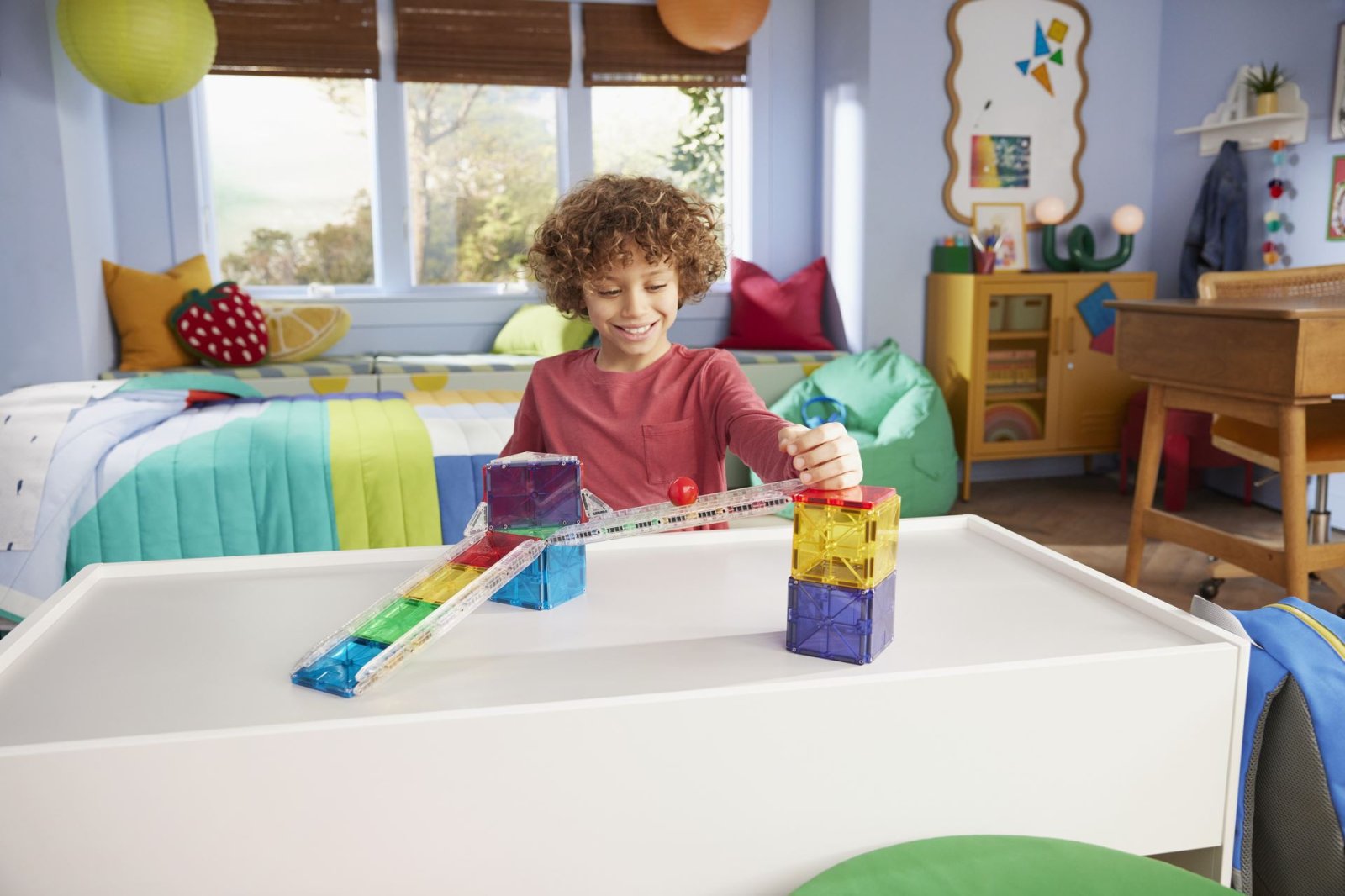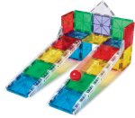 Byg forskellige udfordrende magnetiske kuglebaner med MAGNA-TILES. Inkl. MicroMAGS, kugle og baneskinner.