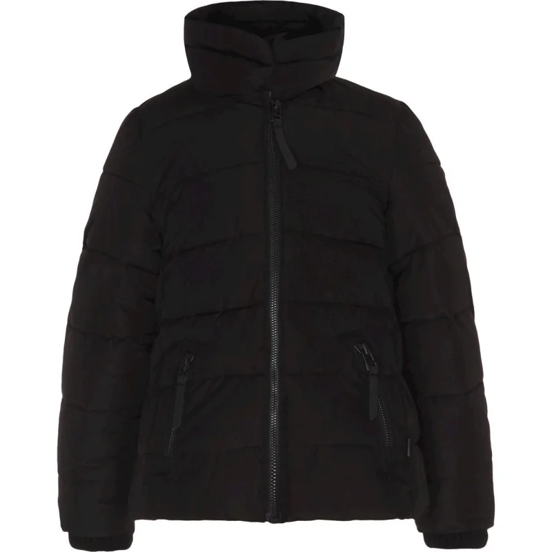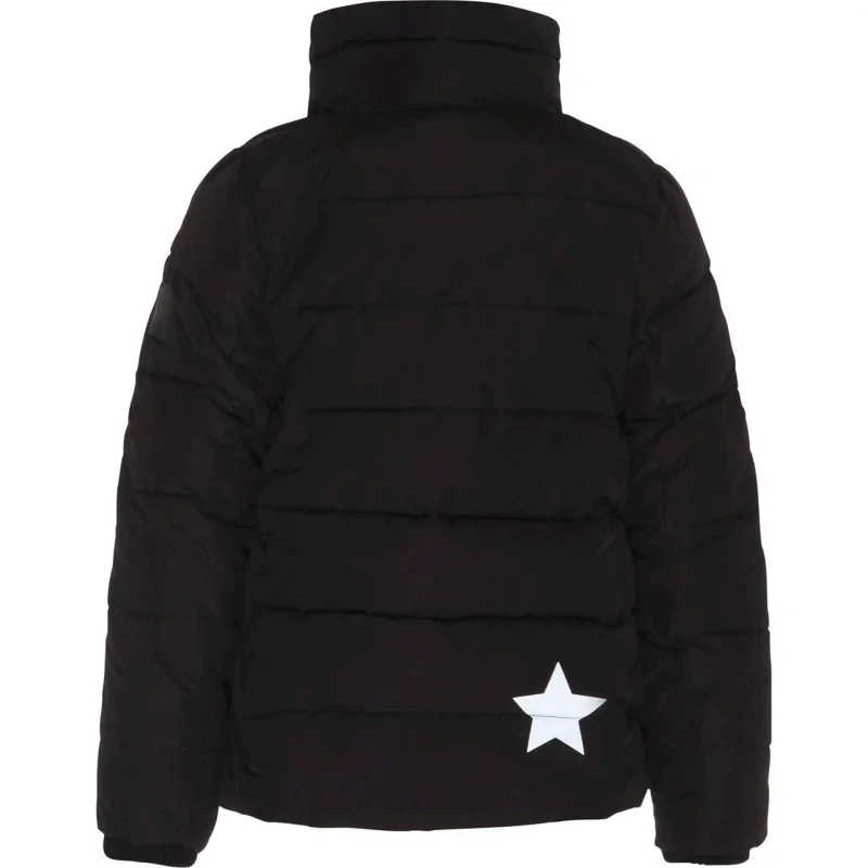 Smart jakke i farven 'Black'. Jakken har høj hals med knaplukning, der varmer godt om halsen og sikrer mod vind og vejr, skrå lynlås på fronten, lommer i siderne, vindfang i rib ved ærmeafslutning samt molo's velkendte stjernerefleks bagpå. Jakken er vandafvisende og desuden foret med flat padding, som giver en god blødhed og holder godt på varmen.