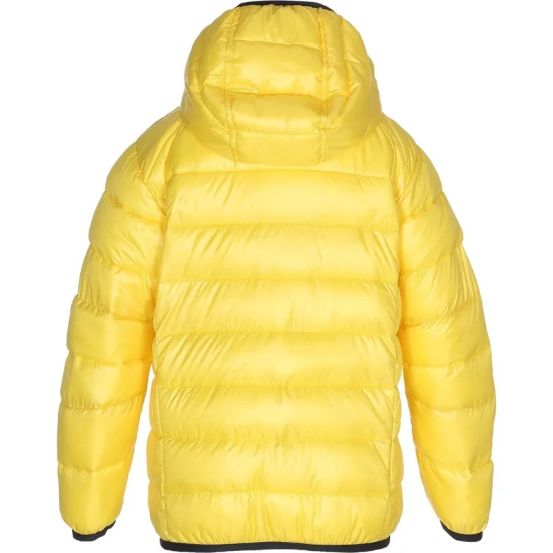 Sporty jakke i gul med aftagelig hætte, lynlåslukning, samt lommer på fronten. Jakken er foret med flat padding, som giver god blødhed, lethed og holder godt på varmen. Kommer med en smart opbevaringspose, som jakken kan pakkes i, så den ikke fylder særligt meget.
