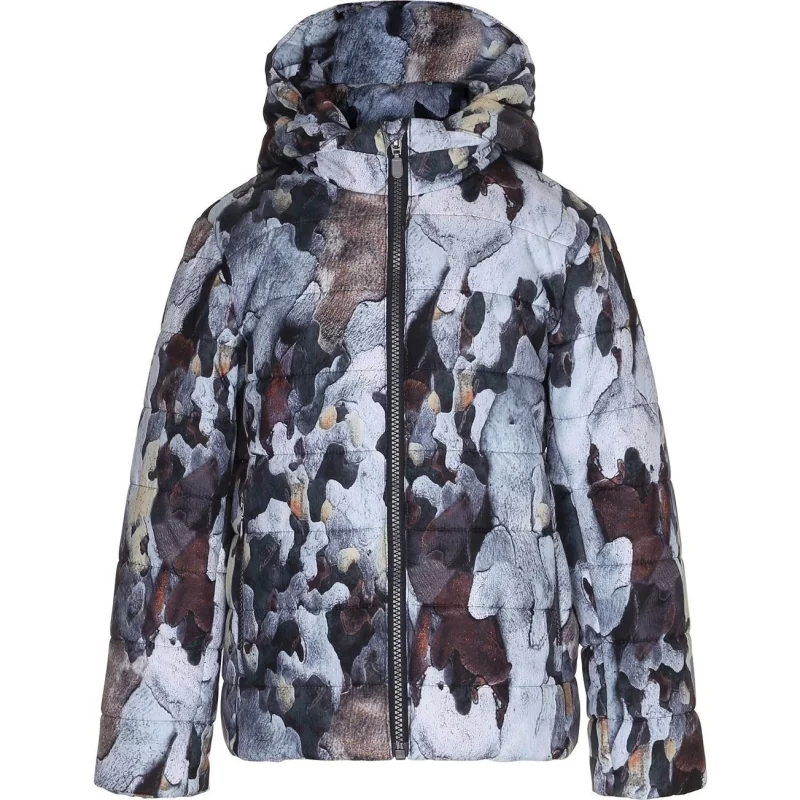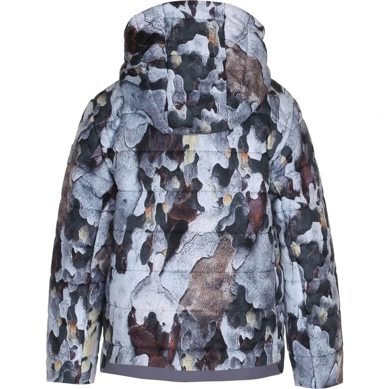 Sporty jakke med digitalt barkprint, aftagelig hætte, lynlåslukning, lommer i siden, samt refleks bagpå. Jakken er vandafvisende og foret med flat padding, som giver god blødhed, lethed og holder godt på varmen.