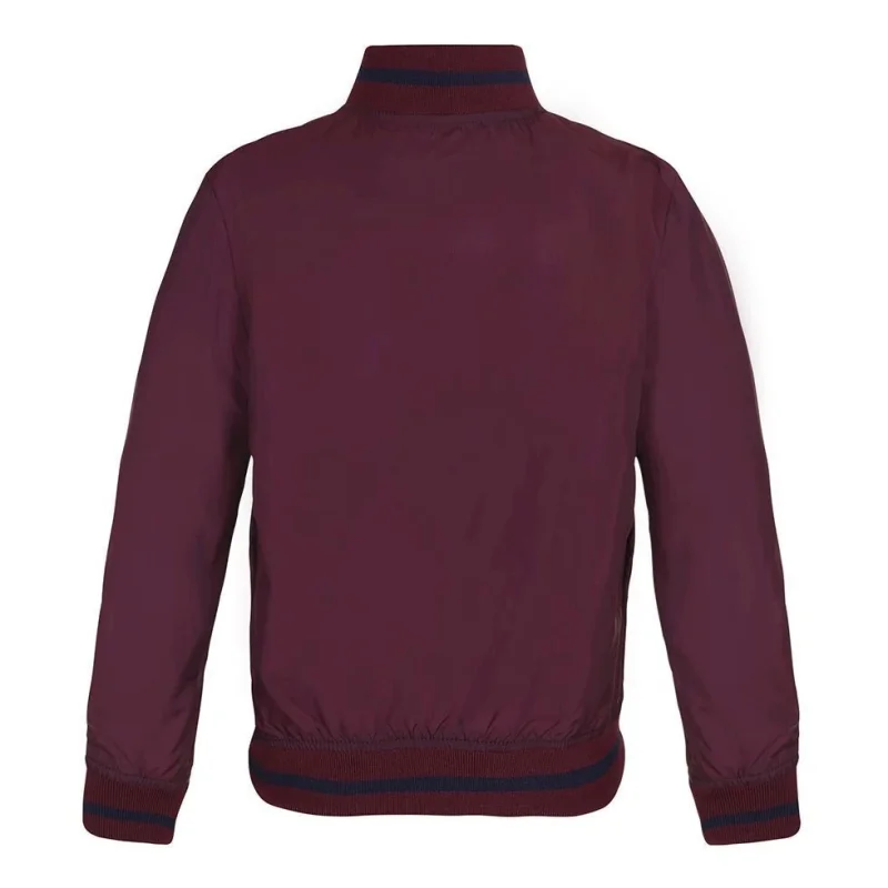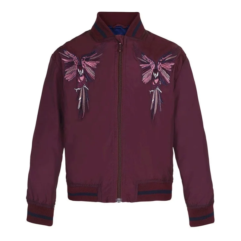 Flot, bordeaux bomber jakke med broderede fugle på fronten. Jakken har lynlås ned langs fronten samt stribet rib ved hals, ærmeafslutning og bund. Dette produkt har en vandafvisende PFC-fri imprægnering (indeholder f.eks. ikke PFOS, PFOA og lignende).
