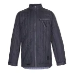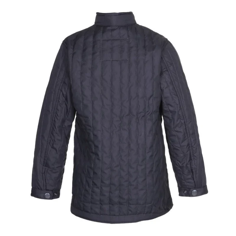 Enkel, sort jakke med sommerdun, kinakrave, lynlås ned langs fronten samt en enkelt lynlås på brystet. Dette produkt har en vandafvisende PFC-fri imprægnering (indeholder f.eks. ikke PFOS, PFOA og lignende).