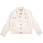 Hvid denim jakke med knapper ned langs fronten og ærmeafslutning, brystlommer samt et sejt broderi af en drage på ryggen.