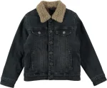 Mørkeblå denimjakke i let, forvasket look med knapper ned langs fronten og ved ærmeafslutning, et læderpatch bagpå samt teddy for indvendigt og på kraven.