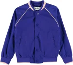 Sporty, blå college jakke med en crispy tekstur. Jakken har knapper ned langs fronten, lommer i siden, stribet rib ved ved hals, ærmeafslutning og bund samt et flot broderi på ryggen.