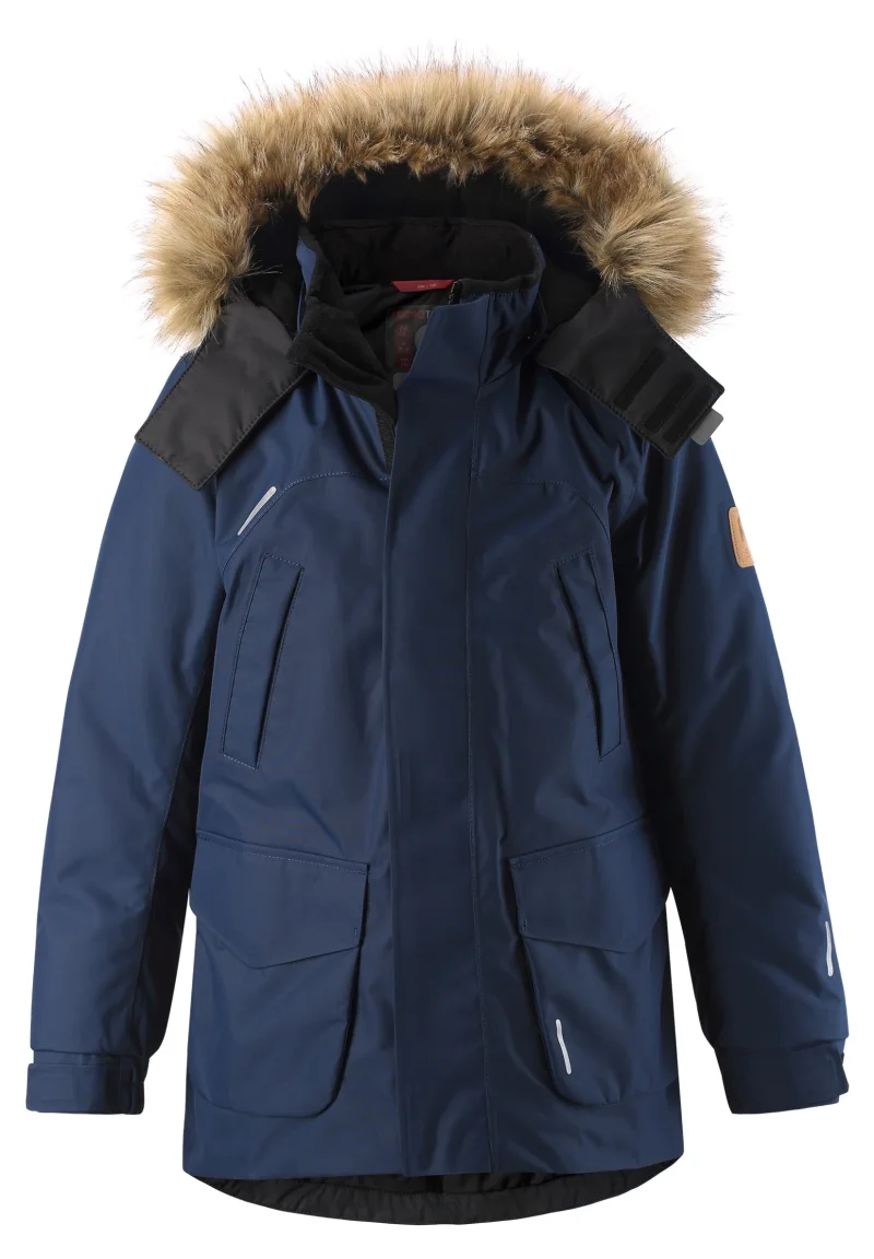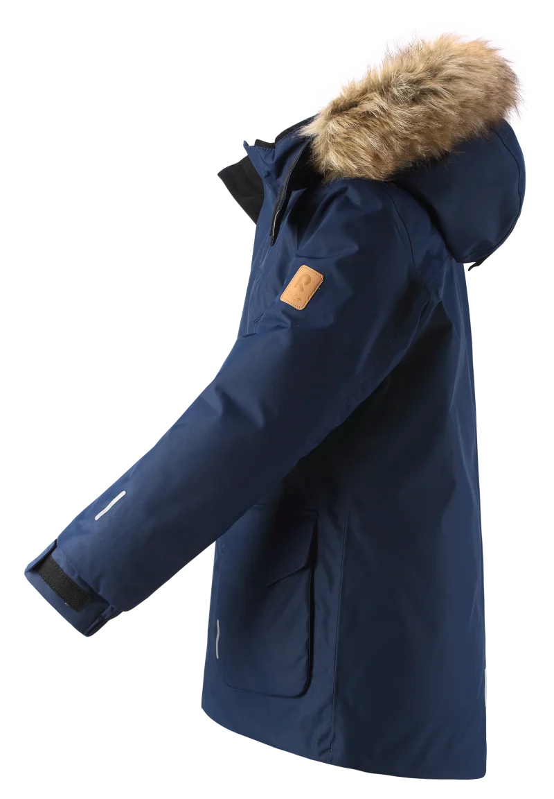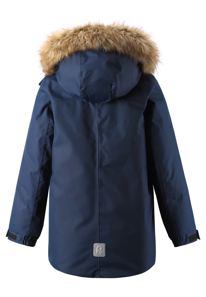 Denne klassiske og varme dunjakke passer til enhver lejlighed og holder aktive friluftseventyrere varme og tørre. Den varme dunjakke til større børn er fremstillet i et vindtæt materiale, som desuden er 100 % vandtæt. Alle sømmene i denne flotte jakke er tapede og vandtætte for at give maksimal komfort, når man leger udenfor om vinteren – uanset hvordan vejret er. Denne længere model kan ved behov justeres både i taljen og den nedre kant for at sikre en god og individuel pasform. Den aftagelige hætte beskytter mod kølige vindstød, men er også sikker ved leg i det fri. Hætten er fastgjort med trykknapper og rykkes nemt af, hvis den hænger fast i noget. For at fuldende det trendy look er hætten udstyret med en elegant aftagelig kant i imiteret pels. De mange lommer kan rumme de vigtigste småting og ser desuden knaldgodt ud. Bemærk den smarte uundværlige løkke der gemmer sig under lommen – sæt dit barns favorit refleks fast i løkken, for at få ekstra synlighed og sikkerhed! Denne supervarme vinterjakke er utroligt nem at pleje takket være den vand- og smudsafvisende overflade, og så kan den tilmed tørretumbles efter vask.