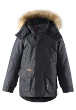 Reimatec dunjakke i parka-stil, meget varm. Flot aftagelig pels på hætten. Fuldstændigt vandtæt jakke med rigtig god åndbarhed. Masser af lommer.