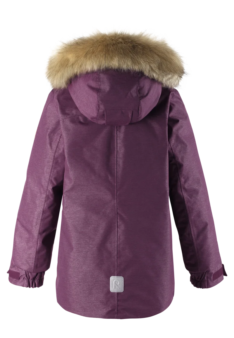 Reimatec dunjakke i parka-stil, meget varm. Flot aftagelig pels på hætten. Fuldstændigt vandtæt jakke med rigtig god åndbarhed. Masser af lommer.