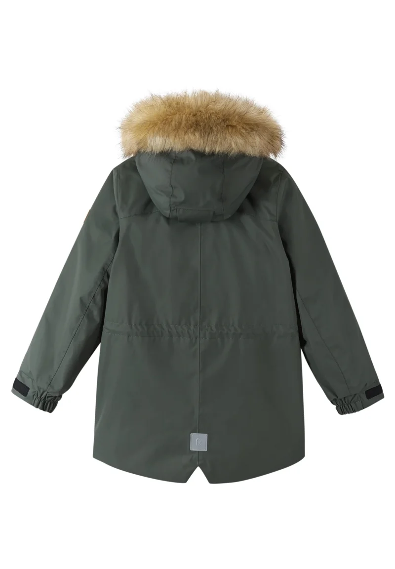 Klassisk vandtæt parka til børn, som passer til alle former for vinterudflugter. Denne lange vinterparka er fremstillet i et teknisk vand- og vindtæt materiale, som også er åndbart og vand- og smudsafvisende. Alle sømme er tapede vandtætte, så børnene kan have det sjovt udenfor om vinteren i al slags vejr. Den lige model kan justeres i parkaens talje og underkant, hvis man ønsker det, så den får en individuel pasform. Jakken har to store klaplommer og to brystlommer – den ene med lynlås. Bemærk den praktiske strop, der skjuler sig i klaplommen – fastgør dit barns refleks eller nøgler i stroppen. Sikker, aftagelig hætte afsluttet med den elegante, aftagelige kant i imiteret pels. Denne plejevenlige jakke kan også tørretumbles.