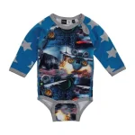Langærmet Molo body med printet Space Animals. Knapperne er rykket frem mellem benene så de er lettere at komme til. Den langærmet Molo Body åbnes/lukkes med trykknapper med en enkelt trykknap ved halsen samt mellem benene.