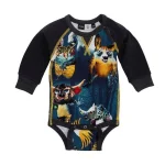 Langærmet Molo body med printet Monsters. Knapperne er rykket frem mellem benene så de er lettere at komme til. Den langærmet Molo Body åbnes/lukkes med trykknapper med en enkelt trykknap ved halsen samt mellem benene.