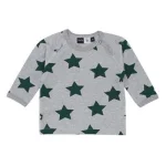 Langærmet T-shirt med stjerneprint i farvekombinationen Green Stars og rib ved hænder og hals. Åbnes og lukkes let med trykknap ved halsen.