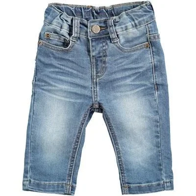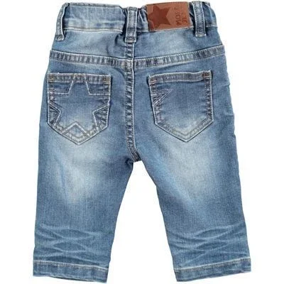 Seje jeans i et forvasket look med elastisk regulerbar talje med trykknapsåbning, bæltestropper samt lommer for og bag. På buksens baglommer er der indsyet en fin stjerne og i taljen sidder et lækkert læderpatch.
