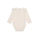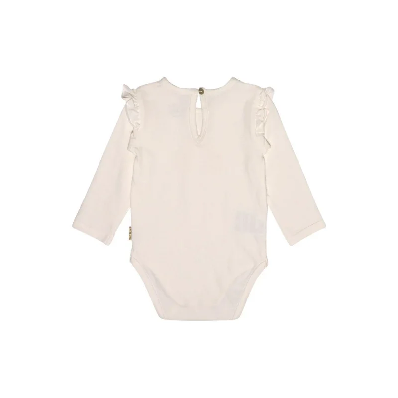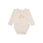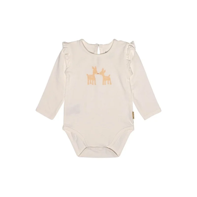 Bodystocking i en blød bomuldsjersey, som lukkes med trykknapper mellem benene, samt med en fin knap i perlomor i nakken. Modellen har fine flæsekanter ved skuldersømmene samt et sødt printet motiv af to rådyr i guld med røde næser. 95% Bomuld 5% Elasthan *Bodyen er hvid (billedet kan virke lilla i farven)*