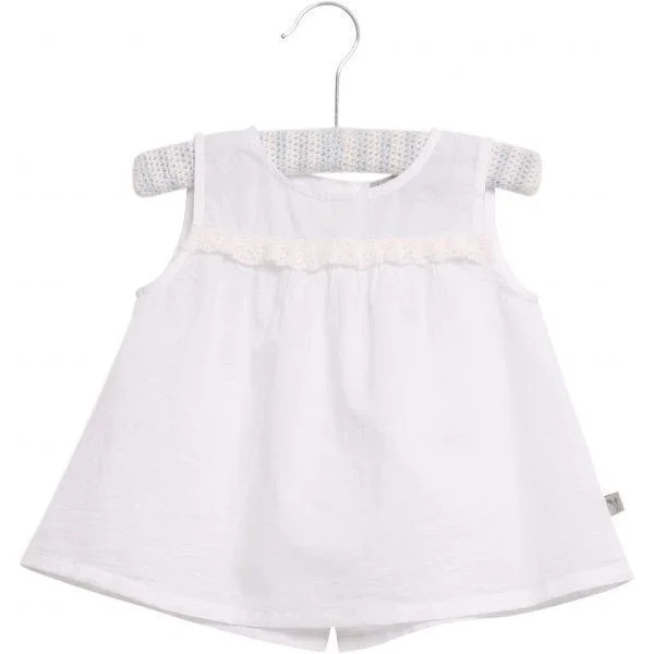 Ærmeløs top med dekorativ blonekant over brystet.