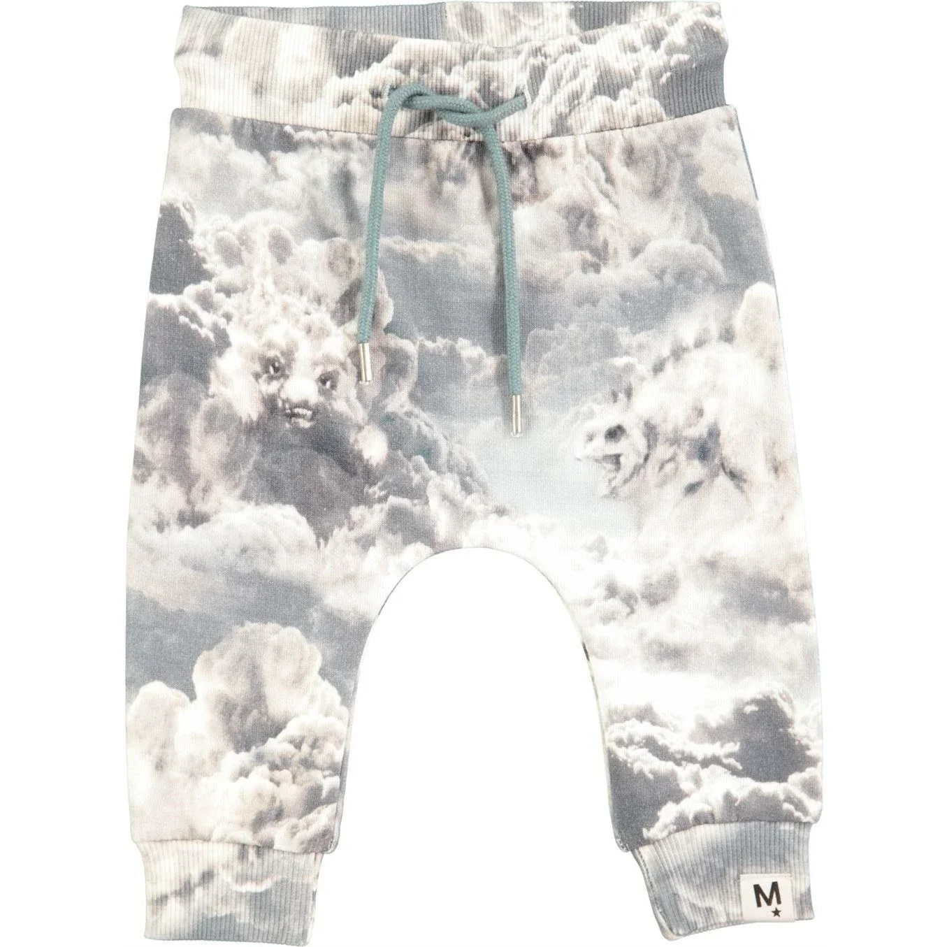 Baby sweatpants med digitalprintede skyer, elastisk talje i rib med justerbart bindebånd samt rib ved anklerne. Dette produkt er Oeko-Tex certificeret.