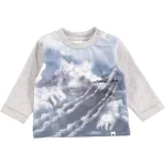 Langærmet, grå baby t-shirt med digitalprintede skyer på fronten. Trykknapper ved halsen gør, at t-shirten kommer let over hovedet. Dette produkt er Oeko-Tex certificeret.
