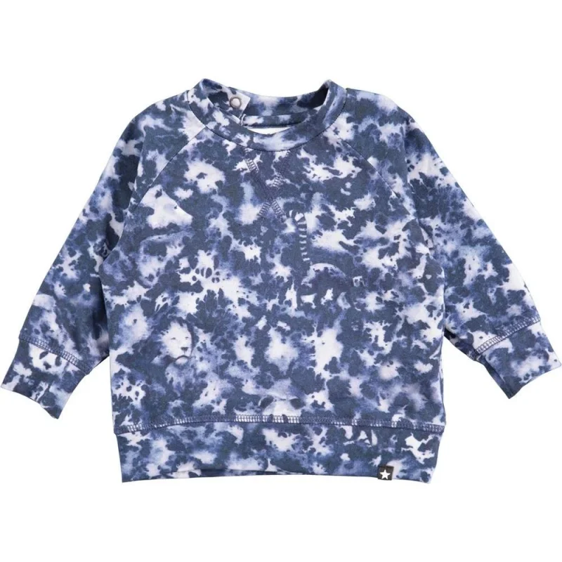 Langærmet, blå baby t-shirt i sweat look med digitalprintede dyr, synlige stikninger og elastiske kanter ved hals, ærmeafslutning og bund. Trykknapper ved halsen gør, at t-shirten kommer let over hovedet. Dette produkt er Oeko-Tex certificeret.