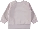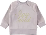Lilla baby sweatshirt med guldfarvet tekst på fronten samt brede, elastiske kanter ved ærmeafslutning og bund.