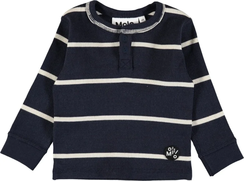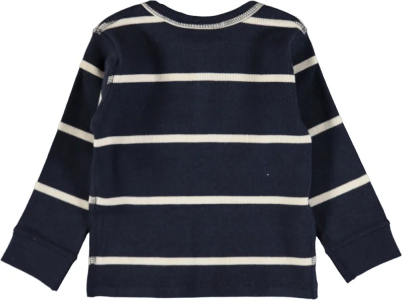 Mørkeblå, stribet baby bluse i blød rib med knapper i halsåbning og et fint, lille logo patch nederst.