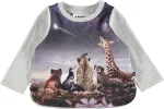 Grå baby bluse med digitalprintede dyr, der kigger på nattehimlen. Trykknapper ved halsen gør det let at få blusen af og på. Dette produkt er Oeko-Tex certificeret.