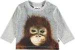 Langærmet, grå baby bluse med en digitalprintet orangutang på fronten. Trykknapper ved halsåbning gør det let at få blusen af og på. Dette produkt er Oeko-Tex certificeret.