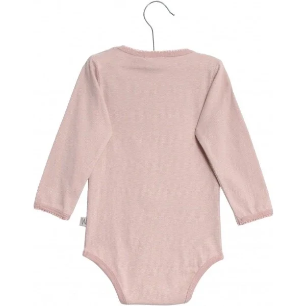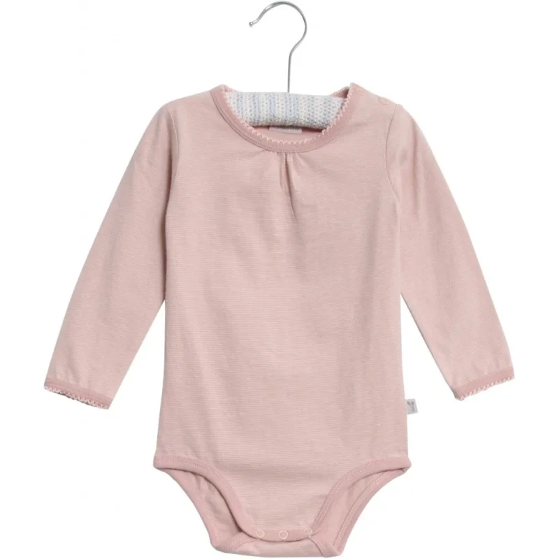 Langærmet body i blød økologisk bomuld med tynde striber. Bodyen har rynk ved halsudskæringen og trykknapper på skulderen for bedre komfort, når du skal klæde din baby på.
