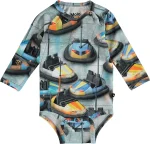 Der er fart og farverige radiobiler på printet "Bumper Car", her på Field, som er en langærmet baby body. Trykknapper ved hals og mellem ben, gør det let at få bodyen af og på. Dette produkt er Oeko-Tex certificeret.
