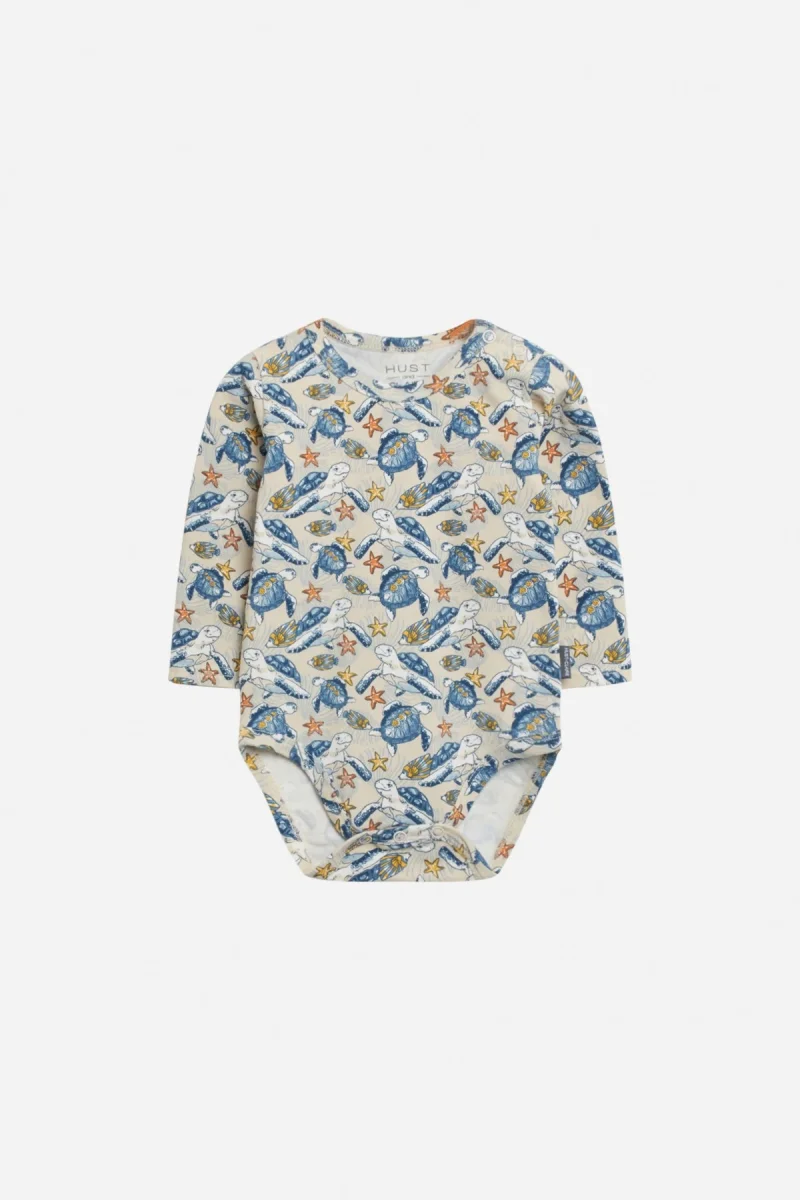 Langærmet bodystocking i strækbar jerseymetervare med skildpaddeprint. Bodystockingen knappes på venstre skulder og mellem benene. Dette produkt er certificeret med Oeko-Tex 100®.