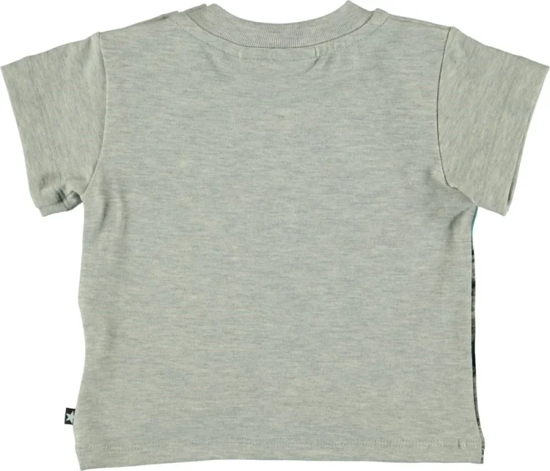 Emilio er en grå baby t-shirt i bomuld med action præget placemet print på fronten. Emilio har knappelukning på skulderen. Dette produkt er Oeko-Tex certificeret.