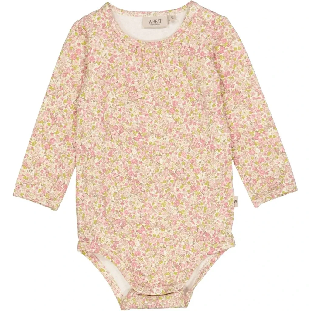 Fin langærmet body med et unikt håndtegnet blomsterprint til din baby. Den er i blød økologisk bomuld med rynk ved halsudskæringen. Bodyen har trykknapper på skulderen samt i benene for bedre komfort, når du skal klæde din baby på.