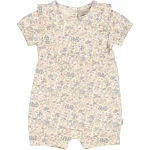 Skøn kortærmet buksedragt i en let økologisk bomuld til din baby. Buksedragten er i et særligt håndtegnet blomsterprint. Den har flere fine detaljer i form af flæsekanter, rynk og knaplukning i ryggen samt benene, så den er nemmere at give dit barn på.