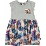 Kortærmet kjole med en bred, rund hals, en ananasprintet lomme på brystet samt et ananasprintet skørt.