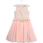 Ærmeløs kjole, der er skåret i taljen med en underdel i blød tyl med masse af vidde. Kjolen har en fin flæse i taljen og knaplukning bagpå.