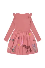 Super fin kjole med ribstrikket overdel med flæsekanter, samt et sødt skørt med blomsterprint. Farve: - Raspberry - Green Jade Materiale: 97% Bomuld, 3% Elastan