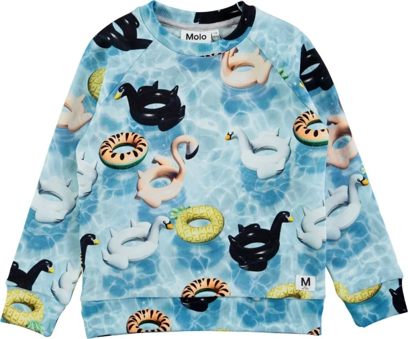 Langærmet, blå sweatshirt med digitalprintede pooldyr samt rib ved hals, ærmeafslutning og bund. Dette produkt er Oeko-Tex certificeret.