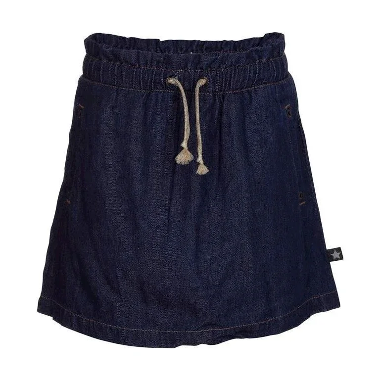 Mørk denimnederdel i A-facon med bindebånd og elastik i taljen. Nederdelen har en fin rynkeeffekt i taljen samt skrålomme i begge sider.