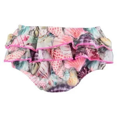 Bikinitrusse med fine flæsekanter og et fint digitalprint til babyer og små børn. Bikinitrussen har et ekstra indsyet indlæg, der sikrer at badetrussen holder tæt, således at det ikke er nødvendigt at bære ble.