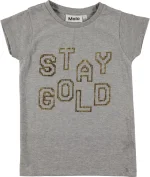 Kortærmet, grå t-shirt i bomuldsmix med guldfarvede bogstaver på fronten. Dette produkt er Oeko-Tex certificeret.