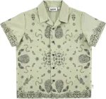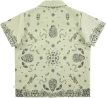 Kortærmet, grøn skjorte med trykknapper ned langs fronten samt sort, mexikansk inspireret print.