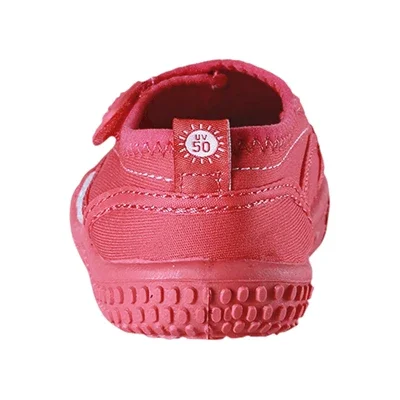 Det perfekte fodtøj til leg på stranden, svømmeture og leg om sommeren – uanset om man er i sandet eller i vandet. Velcrolukningen gør det nemt at tage strandskoene af og på. Materialet på overdelen beskytter mod UV-stråler, og det åndbare netmateriale sikrer en god komfort på varme sommerdage. Det termoplastiske gummi i ydersålen beskytter mod det varme sand og sikrer et godt fodfæste på såvel stenede strandbredder som på sejlture. Strandskoene er designet til at matche farverne i Reimas SunProof-kollektion med UV-beskyttelse.