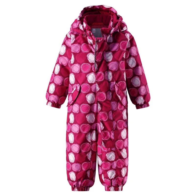 Fremragende vinterflyverdragt til tumlinger! Flyverdragtens hovedsømme er tapede, og den er fremstillet i et smudsafvisende og vand- og vindtæt materiale. Den isolerende siddepude giver varme i sneen. Et glat for og en lang lynlås gør det let at få den på, og taljen kan justeres. De to klaplommer kan være et sikkert gemmested til barnets små skatte.