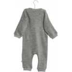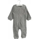 Blød sparkedragt i filtet merinould med rib nederst på ærmerne og benene.